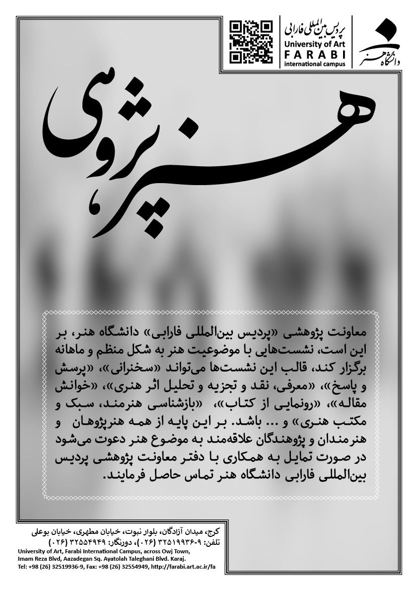 معاونت پژوهشی پردیس بین المللی فارابی برگزار می کند ۲۰ آذر ۱۳۹۷ | ۰۹:۳۳ کد : ۲۰۸۷ در پردیس کرج چه میگذرد؟ ارسال به دیگران نام شما ایمیل شما ایمیل دریافتکننده ارسال انصراف تعداد بازدید:۵۴۷
