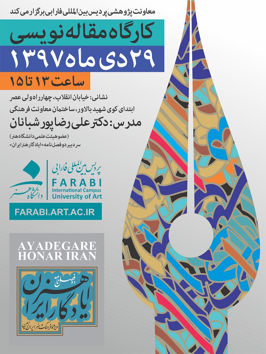 کارگاه مقاله نویسی به اهتمام معاونت پژوهشی پردیس بین المللی فارابی با شرکت ۲۸ تن از دانشجویان پردیس فارابی از دو گروه معماری و نوازندگی جهانی مطابق برنامه در دو نوبت و در ساعت های ۱۳ تا ۱۵ و ۱۵ تا ۱۷ روز شنبه ۲۹ دی ماه در ساختمان شهید بالاور برگزار شد.